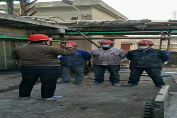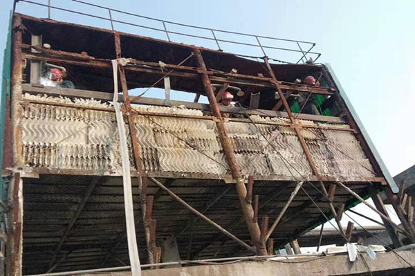 在完成相關(guān)作業(yè)的準備工作,穿戴好各類(lèi)防護用品,簽發(fā)了各類(lèi)票證后,大家就進(jìn)入到檢修現場(chǎng)。加固冷卻塔前,必須先拆除冷卻塔壁板,清洗冷卻塔填料雜物及易燃易爆物質(zhì)。由于冷卻塔結構腐蝕嚴重,填料內部含易燃易爆物質(zhì)多,所以必須對冷卻塔進(jìn)行多次沖洗徹底除去易燃易爆物質(zhì)才能進(jìn)行動(dòng)火加固作業(yè)。