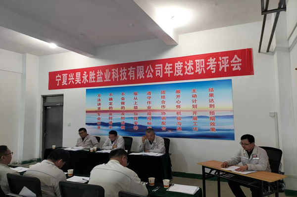 2023年11月14日,寧夏興昊永勝鹽業(yè)科技有限公司組織召開(kāi)管理人員年度述職考評會(huì )議。職能科室負責人、專(zhuān)業(yè)技術(shù)人員、生產(chǎn)調度和各裝置正副裝置長(cháng)等19名管理人員進(jìn)行述職,33名職工代表列席會(huì )議。